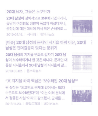 '20대 남성'에 대한 언론, 정치권, 학계 등에서의 관심이 쉽게 꺼지지 않고 있다. 지난해 12 월, 리서치업체 한국갤럽의 국정수행 지지도 조사 결과, 전통적으로 민주당 지지층으로 여 겨졌던 20대 남성이 노년층보다도 문재인 대통령을 덜 지지하는 것으로 나타나면서부터다. 이후 여러 매체에서 이 현상을 이해하려는 방편으로 20대 남성들을 설문조사, FGI 등의 기 법으로 취재한 기사들을 내놓았으며, 몇몇 정치인들도 20대 남성 당사자의 목소리를 듣는 방식의 행사를 기획했다. 최근에는 시사주간지 <시사IN>의 3부작 기획이 이례적으로 많은 사회적 관심을 얻으며 '20대 남성'에 대한 관심에 다시 불을 붙였다.