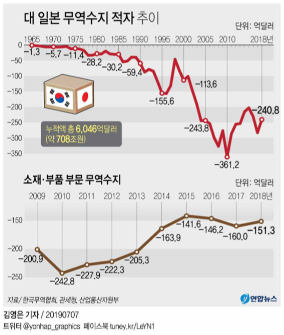 - 실제로 2000년에 59억달러이었던 대일본무역수지 적자가 2010 년에는 최대 규모인 361억달러로 6배 증가했다. <연합뉴스>, “한 일수교 후 대일교역 적자만 54년째 누적적자 700조원넘어”, 김경 윤, 2019.07.07 [본문으로]