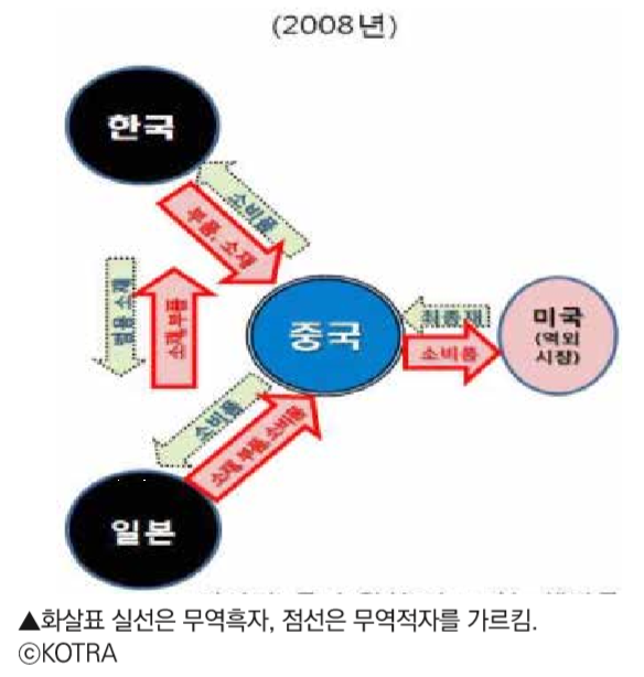 동아시아의 국제적 분업은 중국을 중심으로 하여 중간재 교역과 최종재 완성이 이뤄지고, 미국이라는 역외시장에 소비품을 공급하는 구조다.(KOTRA 2017) 한중일 삼국만 살펴보면, 서로 가위·바위·보처럼 무역수지 흑자로 얽혀있다. 한국은 중국에 대한 중간재 수출로 중국과의 무역수지의 흑자를 보고, 중국은 일본과의 교역에서 무역수지의 흑자를 본다. 또한, 일본은 한국에게서 중간재 수출을 통해서 무역수지의 흑자를 본다.