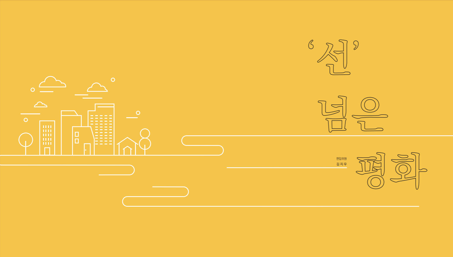 하지만 지구 종말이 초 세기를 앞둔 지금, 우리는 전쟁이 아닌 ‘평화’가 필요하다. 유엔헌장도 세계’평화’와 안전을, 세계인권선언도 세계 ‘평화’의 기초를 강조한다. 평화가 대체 무엇이길래? 표준국어대사전의 정의대로 ‘평온하고 화목’하다든지 ‘전쟁, 분쟁 또는 일체의 갈등이 없이 평온함 또는 그런 상태’라고 생각하면 되는 걸까. 그렇다면 70억 명의 사람들이 한데 모여 살아가고 있는 이 지구에서 어떠한 전쟁도, 분쟁도 없는, 일체의 갈등이 존재하지 않는 상태는 과연 가능한 걸까. 게다가 지금은 코로나 19로 인한 전 지구적 비상 사태 아닌가.
