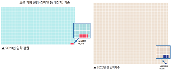8명이라는 입학 정원도 턱없이 적지만 선발되는 숫자는 심지어 그것보다도 적다. 학교는 고른기회전형으로 한 해 5명 이상 선발한 적이 단 한 차례도 없었다. 2020년에는 고작 3명만이 고른기회전형으로 입학했다. 수시 모집은 인원을 덜 뽑는 경우가 없으니 입학 정원(3,379명)을 그대로 비교해서 말하자면 비장애 학생 2000명이 입학할 때 2명이 채 안되는 장애 학생이 중앙대의 문턱을 넘는 것이다.