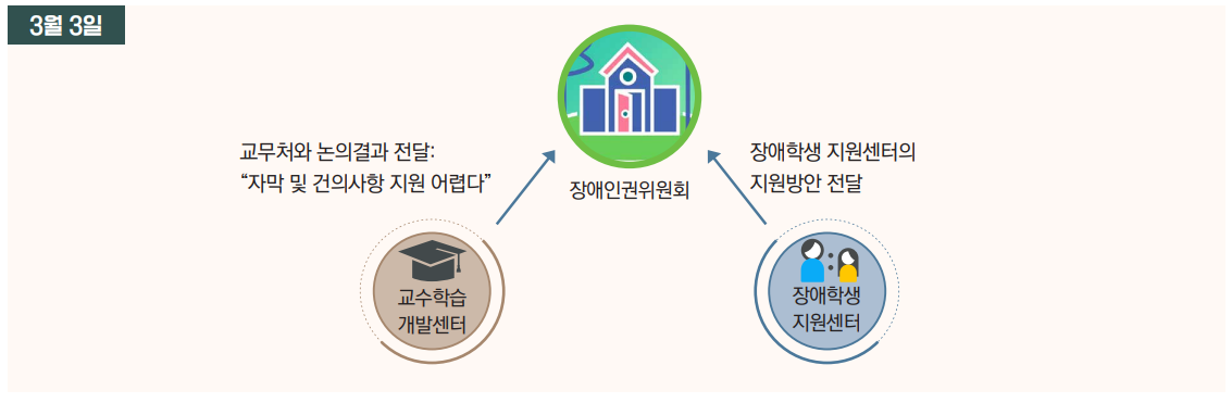 장애인권위원회는 장애학생지원센터 실무자에게 장애학생 지원 업무가 과중되고 학교 본부에 직접 지원을 건의하기 어려운 문제 상황을 제기하며 본부에 장애학생 지원 체계를 바로 잡을 것을 요구하고 있다.