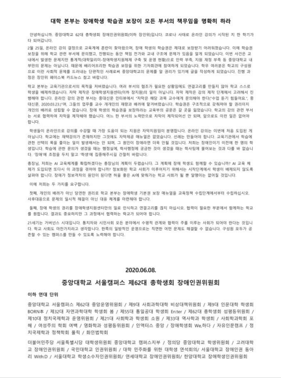 강의 내용이 장애 학생들에게 잘 전달되기 위해서는 몇몇 조건들이 준비되어야 한다. 청각 장애인이 수업을 듣기 위해서는 자막 지원이나 입모양이 또렷하게 보이는 교수자의 얼굴이 영상에 포함되어야 하고, 시각 장애인의 경우 화면을 음성으로 인식해 활용하기 때문에 접근이 쉬운 웹 페이지 환경 조성도 필요하다. 그러나 그 어떤 것도 사전적으로 준비된 것은 없었다. 이대로라면 학기 내내 수업 내용이 무엇인지 아는 것조차 어려웠다. 중앙대학교 서울캠퍼스 62대 총학생회 장애인권위원회(이하 장인위) 측은 ▲청각 장애 학생을 위한 자막 삽입 ▲ 시각 장애 학생 수강 학습 자료를 한글과 워드 파일로 제공 ▲ 실시간 원격 속기 지원 ▲ 학생 도우미 동석을 통한 실시간 학습 지원을 학교 본부에 요청했다.