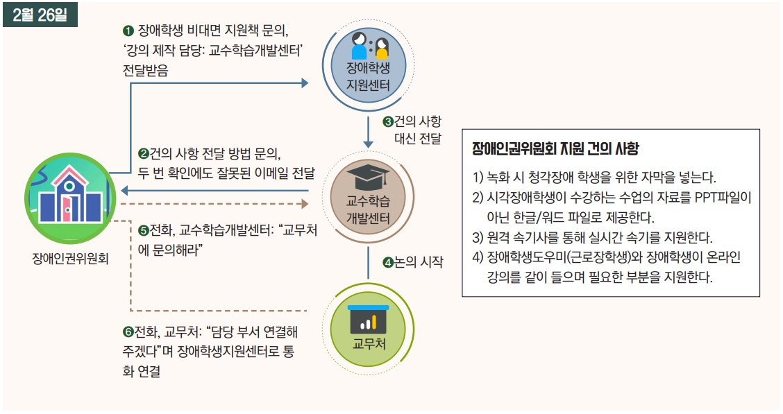 비대면 수업이 처음 결정된 25일 이후 62대 총학생회 장애인권위원회는 장애학생 지원센터에 장애학생을 위한 별도의 비대면 지원책이 있는지 질문했다. 2월 26일, 장애인권위원회는 장애학생 비대면 지원책이 마련되어 있지 않다는 사실을 확인했다. 장애인권위원회는 비대면 수업에 필요한 건의사항을 전달하기 위해 강의 제작 담당 기관인 교수학습개발센터에 연락했다. 교수학습개발센터는 교무처에 문의하라며 책임을 넘겼고, 그렇게 연락한 교무처에서 "담당 기관을 연결해 주겠다"며 연결한 곳은 다시 장애학생 지원센터였다.