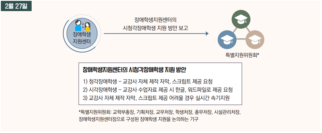2월 27일, 특별지원위원회의 정기 회의가 열렸다. 특별지원위원회는 교학부총장, 기획처장, 교무처장, 학생처장, 총무처장, 시설관리처장, 장애학생지원센터장으로 구성되어 장애학생 지원 방법과 협조 내용을 논의하는 기구다. 장애인권위원회는 비대면 교수자의 이야기를 자막으로 동시에 송출하는 영상 형태로 수업을 진행할 것을 요구했다. 특별지원위원회는 수업을 진행하는 각 교강사에게 자막이 있는 강의 영상을 제작하도록 맡기고 별도의 조치는 취하지 않았다.