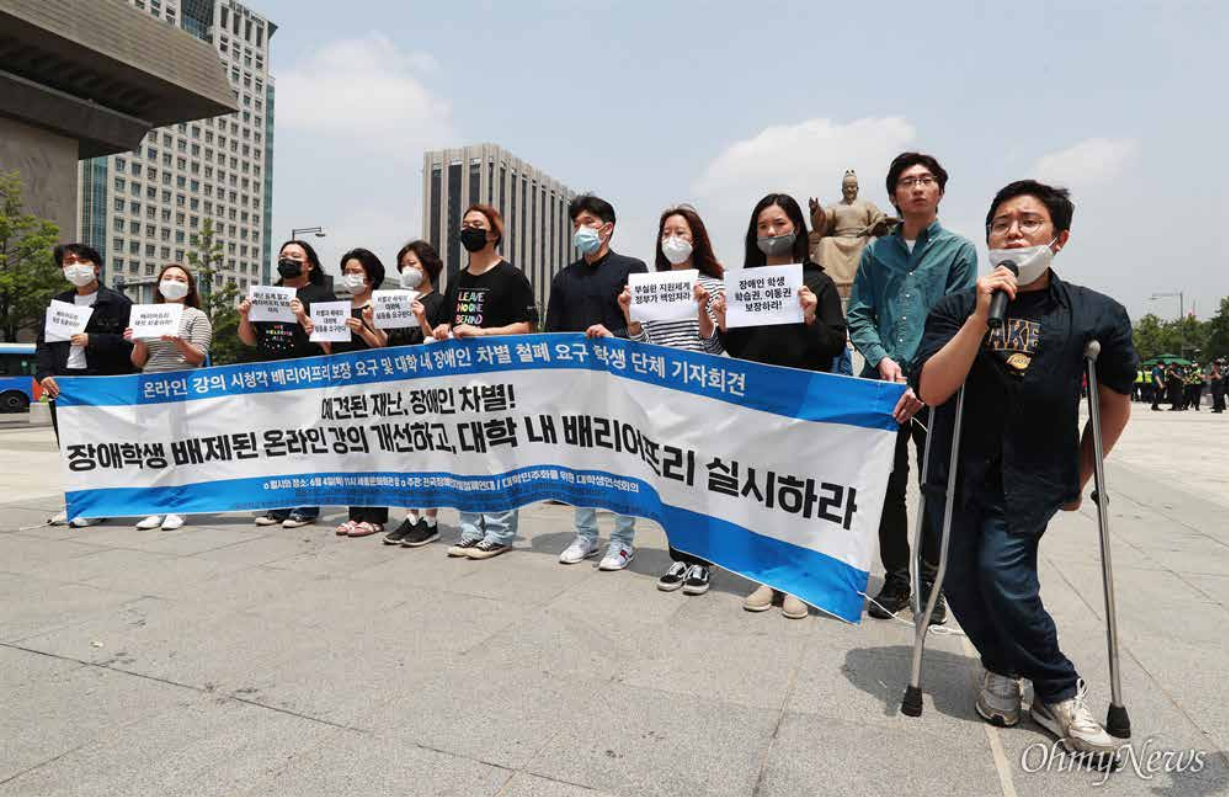 6월 4일 광화문 세종대왕상 앞에서 10개 대학생 단체들[1]이 기자회견을 주최했다.장애 학생의 지원책이 배제된 비대면 강의 결정을 규탄하며 대학의 배리어 프리[2] 실현을 요구하는 발언들이 이어졌다.
