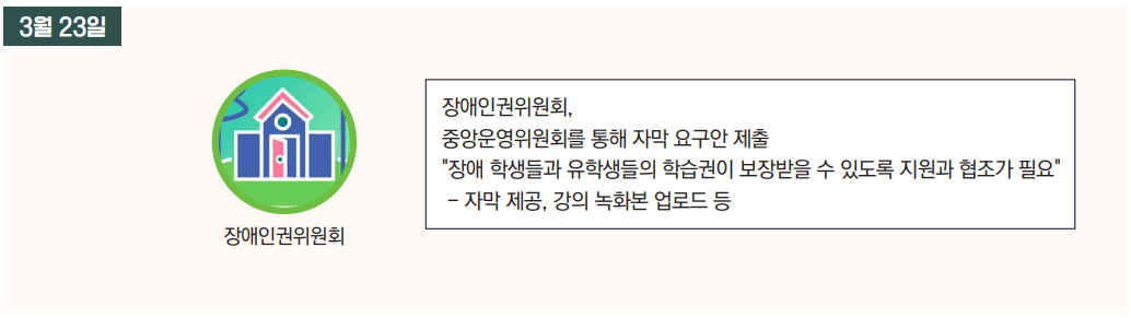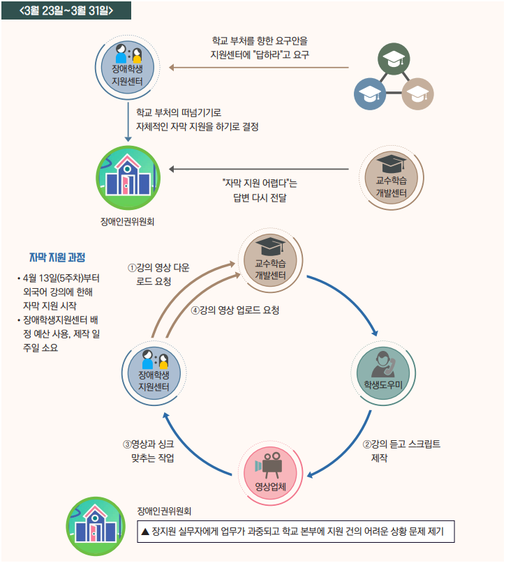 교수학습개발센터는 교무처와 논의 결과 장애인권위원회가 2월 26일에 건의한 사항을 지원하기 어렵다는 논의 결과를 전달했고, 장애학생 지원센터는 대신 센터 자체에서 지원할 수 있는 사항을 장애인권위원회에 전달했다. 장애인권위원회는 본부에 전달하는 중앙운영위원회의 요구안에 "장애 학생들과 유학생들의 학습권이 보장받을 수 있도록 자막과 강의 녹화본을 업로드 해달라"는 조항을 넣었다.