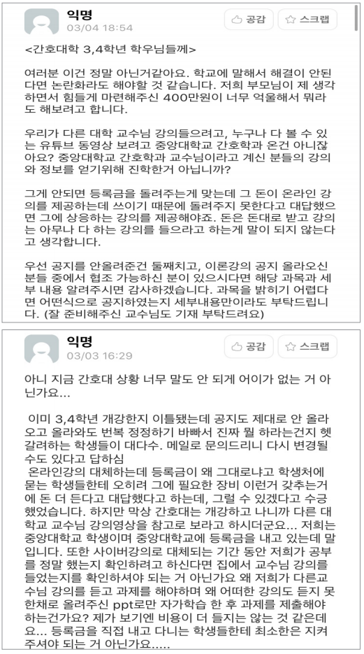 간호학과 A 강의는 타 학교 교수가 유튜브에 올린 자료로 온라인 수업을 대체했다. 학생들은 에브리타임에 해당 온라인 강의의 문제점을 게시하고, 이를 공론화하려는 움직임을 보이기도 했다. 게임·인터렉티브 융합전공의 B 강의는 동일한 영상으로 두 가지 강의를 동시에 진행하는 일이 일어났다. 해당 강의 수강생은 “교수님이 ’이번 강의는 ○○ 강의와 함께 진행합니다’라는 멘트와 함께 강의 파일을 올렸다. 내가 듣지도 않는 강의 내용을 왜 보고 있는지 이해가 안 됐다. 그냥 수업 두 개를 영상 하나로 퉁치는 느낌이었다.” 고 전했다. 공공인재학부의 C 강의는 교수의 설명없이 PPT 자료만 올라왔다. 공공인재를 복수전공 하는 한 학생은 “처음 2주 동안 파워포인트 자료를 업로드 하는 것으로 수업을 대체했다”며 불편을 토로했다.