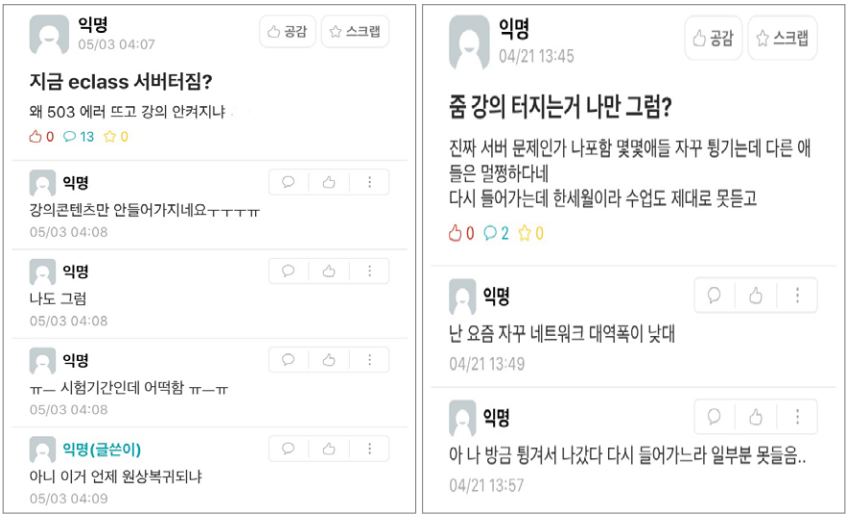 그들의 말처럼 비대면 강의 환경은 열악했다. 개강일부터 서버 문제가 발생하며 원활한 수업 진행이 되지 못했다. 그 이후로도 에브리타임에는 서버 문제로 실시간 강의에서 ‘튕겨 나왔다’는 후기가 올라왔다. 서버 문제로 학생들은 서버가 안정될 때까지 강의를 듣지 못해 강의 일정 부분을 놓칠 수밖에 없었다.