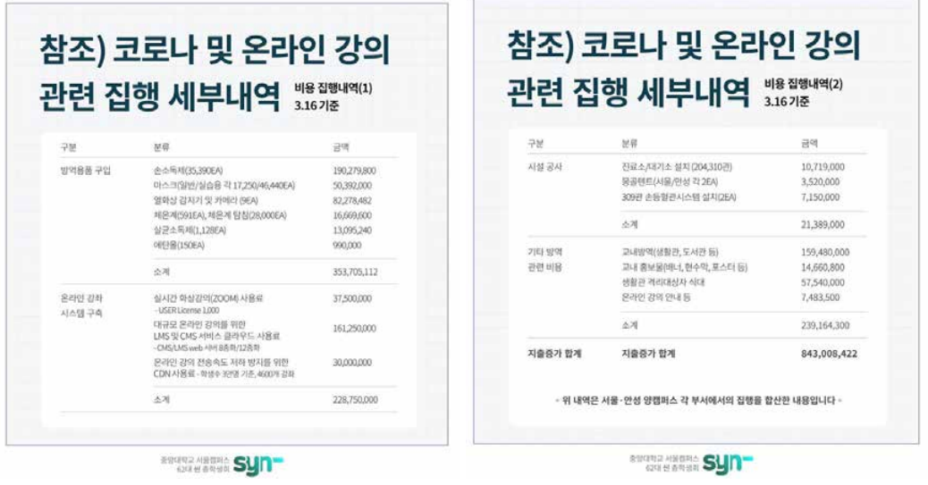 코로나 19 확산 이후 투명한 회계 내역 공개는 없었다. 서울캠 총학생회가 4월 2일 페이스북에 게시한 ‘코로나 19 관련 집행 세부 내역’이 학생들에게 유일하게 허락된 회계 내역이었다. 이름만 세부 내역이었고, 자세한 사용처는 나와 있지도 않았다. 이 내역을 끝으로 종강까지 추가적인 공개는 없었다. 당시(4월 2일) 서울캠퍼스 중앙운영위원회는 방역 용품 등의 상세한 사용처 공개를 요청할 예정이라고 했으나, 이후 사용처에 대해 전달받았다는 이야기나 학교의 대답은 없었다. 사용처는 지출분의 타당성을 파악하는 기본적인 지표지만 학생들은 확인할 수 없었다.