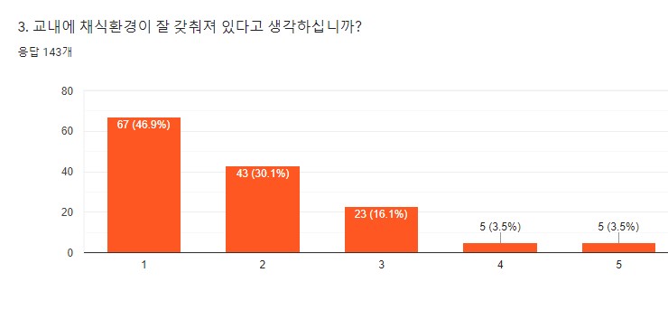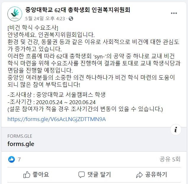 그래도 최근 총학생회 산하 인권복지위원회에서 비건 학식 마련을 위한 수요 조사를 진행하는 등 다양한 요구를 포용하려는 시도들이 보여요.
