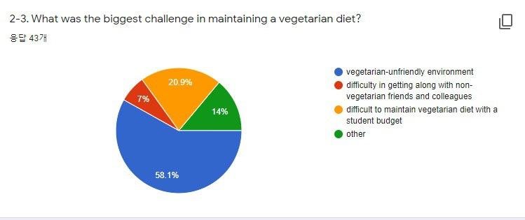 소현: 교내 150명 정도를 대상으로 설문을 진행했어요. 결과를 보니까 응답자 중 74.1%가 채식을 지향하고 있었고, 채식을 지향하든 지향하지 않든 46.9%가 ‘교내 채식 환경이 갖춰지지 않았음’에 동의하고 있더라고요. 게다가 비거니즘이 아닌 다른 이유로 인해 학식을 먹지 못하고 있다고 말한 비율이 25.9%나 됐어요. 응답자 4분의 1이 넘는 숫자잖아요.
