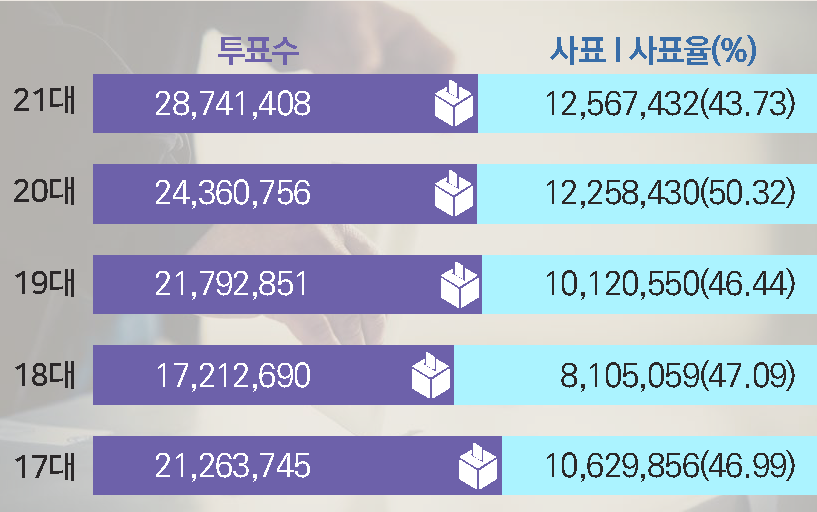 21대 총선에서 사표율은 하락했다.15 사표는 개표 후 집계됐지만 선거 결과에 반영되지 못한 유권자의 표16로, 전체 표 중 사표의 비중이 사표율이다. 21대 총선에서 사표율은 43.73%, 20대 총선(50.32%)에 비해 6.59%P 감소했다. 40% 후반대를 기록한 19대, 18대, 17대에 비해서도 낮았다. 이는 전보다 더 많은 표가 선거 결과에 반영된 것을 보여준다. 즉 힘 있는 당선자의 더 확실한 당선을 의미한다. 소수정당 진보 후보에게 던져진 표는 여전히 1번과 2번 후보 사이에서 사표가 되었다. 사표율은 낮아졌고 군소 진보 후보 앞에 놓인 사표의 벽은 높아졌다.