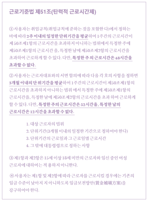 탄력근로제의 내용을 들여다보기에 앞서 명확히 확인해야 하는 지점은 고용노동부가 유연근로시간제 가 이드를 발표한 것에서 확인할 수 있듯이 ‘탄력적 근로시간제’는 새로운 조항들이 신설되는 것이 아니다. 현재 있는 제도에 대해서 조금 더 폭넓게 기업이 제도를 활용할 수 있도록 확대하기 위한 것들을 ‘개선’이라는 표현으로 지적하고 있는 것이라고 볼 수 있다. 우선적으로 탄력적 근로시간제 확대에 대한 내용을 기술하기에 앞서, 기존의 탄력적 근로시간제에 대한 이해를 하는 것이 필요하다. 실질적으로 법령상에서는 ‘유연근로시간제’와 ‘탄력적 근로시간제’가 구분되어 기술되어 있지만, 이해를 쉽게 하기 위해서 현재 집중적으로 논쟁이 되고 있는 ‘탄력적 근로시간제’를 중심으로 이야기해보고자 한다.