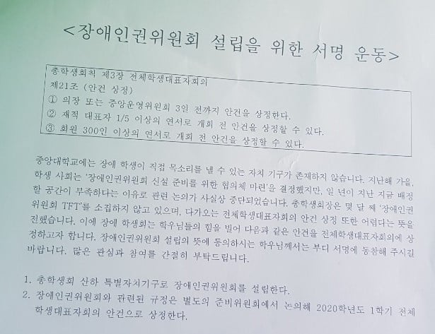 장애학생자치기구 tft가 장애인권위원회(장인위) 설립의 전체학생대표자회의(전학대회) 안건상정을 목표로 서명운동을 진행했다. 구체적 안건으로는 ▲총학생회 산하 특별자치기구로 장인위 신설 ▲관련 규정은 별도의 준비위원회에서 논의해 다음 학기 전학대회 안건으로 상정이 제시되었다. 총학생회칙 제21조에 따르면 재적생 300인 이상의 연서명으로 전학대회 개회 전 안건상정이 가능하다.