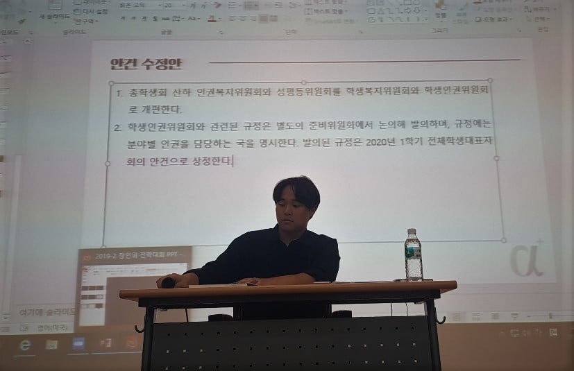 한편 김민진 서울캠 총학생회장은 장인위 필요성을 다시한번 부정하는 동시에 성평위, 인복위 폐지와 학생복지위원회, 학생인권위원회로의 개편을 주장했다. 뒤이어 장애인권위원회(장인위) 설립 안건을 ▲인권복지위원회와 성평등위원회를 학생복지위원회와 학생인권위원회로 개편 ▲ 관련된 규정은 별도의 준비위원회에서 논의해 발의, 규정에는 분야별 인권을 담당하는 국을 명시 두 가지로 수정할 것을 발의했다. 해당 수정안으로의 변경은 의사 정족수 308명 중 116명 찬성, 106명 반대로 부결됐다.