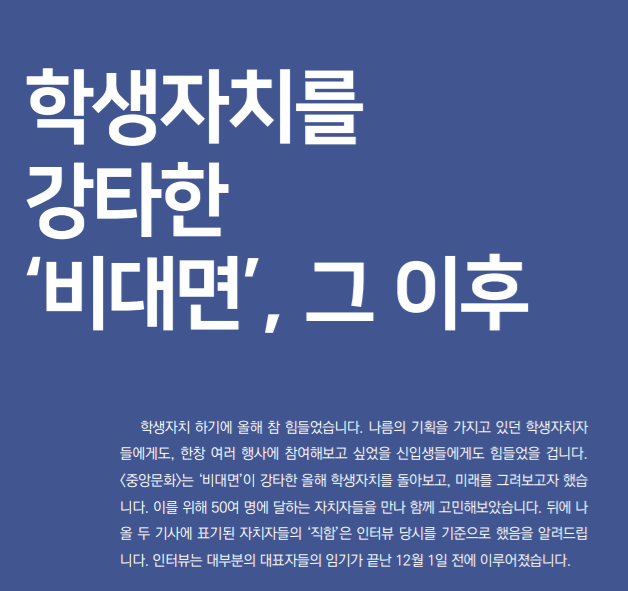 코로나19로 많은 것들이 바뀐 해였다. 학생자치 역시 변화를 피할 수 없었다. 대책을 세울 틈없이 학생자치 활동은 축소됐고, 활동 영역은 온라인으로 바뀌었다. 이전에 언급되던 ‘학생자치의 위기’와는 다른 형태였다. 사람들은 코로나19로 변화와 혁신이 앞당겨졌다며 미래를 준비한다. 중앙문화는 학생자 치의 미래를 섣불리 예측하기 이전, 2020년 학생자치의 모습을 되돌아봤다.