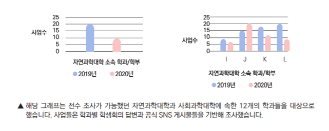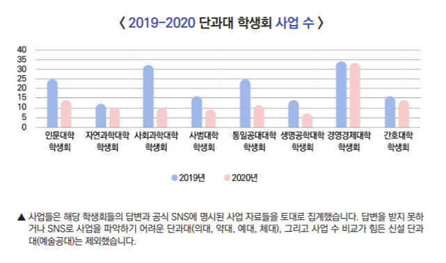 (학생들이) 학생회에 관심을 가지게 되는 큰 요인 중 하나는 학생회 주관 사업입니다. 행사들을 비대면으로 진행하며 학생들의 관심과 사랑을 이전만큼 받지 못하게 되었습니다. 이로 인해 학생회가 학생들의 관심에서 점점 멀어져갔다고 생각합니다. 자연스럽게 저희의 후임을 구하는 것도 어려운 일이 되어버렸습니다. (자연과학대학 학생회 봄)