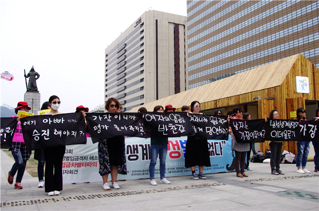 한국여성노동자회와 여성노동자회 11개 지부는 2019.5.17. 광화문광장에 모여 성별임금격차 해소를 요구하며 “생계에 성별은 없다!”고 외쳤다. 남성정규직 임금 대비 여성비정규직은 37.5%의 임금밖에 받지 못하기 때문에 5월 17일은 일 년 중 비정규직 여성노동자들의 무급노동이 시작되는 날이다. 이날을 <임금차별타파의 날>로 정하고 3년째 행사를 진행했다. <3.8조기퇴근시위 ‘3시STOP’>과 함께 여성노동자회가 성별임금격차의 실태를 알려내는 활동으로 성별임금격차가 해소되는 날까지 진행될 것이다.