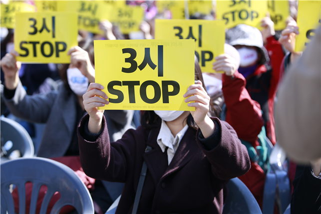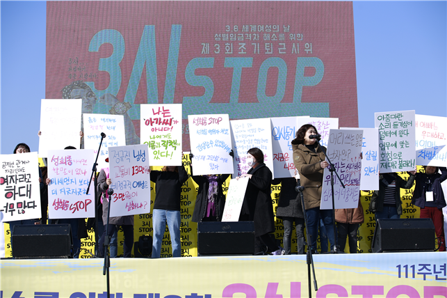 #페이미투(#PayMeToo) 운동1한국여성노동자회는 성차별적 노동현실을 전 사회적으로 이슈화시키기 위해 2017년 여성, 시민, 사회단체 및 노동조합에 연대를 제안하여 <3.8조기퇴근시위 ‘3시STOP’공동행동>(이하 공동행동)을 발족시켰다. 공동행동은 ‘성별임극격차 해소’를 슬로건으로 채택하고, 매년 3월 8일 오후 3시 조기퇴근시위를 진행하고 있다. 한국의 성별임금격차인 ‘100:64’를 1일 근로시간 8시간으로 환산하면 여성은 3시부터 무급으로 일하는 셈이다. 한국여성노동자회는 성별임금격차를 상징성 있게 보여주기 위해 세계여성의날인 3월 8일 3시부터는 일하지 않는 성평등 파업을 2017년부터 매년 진행하고 있다.