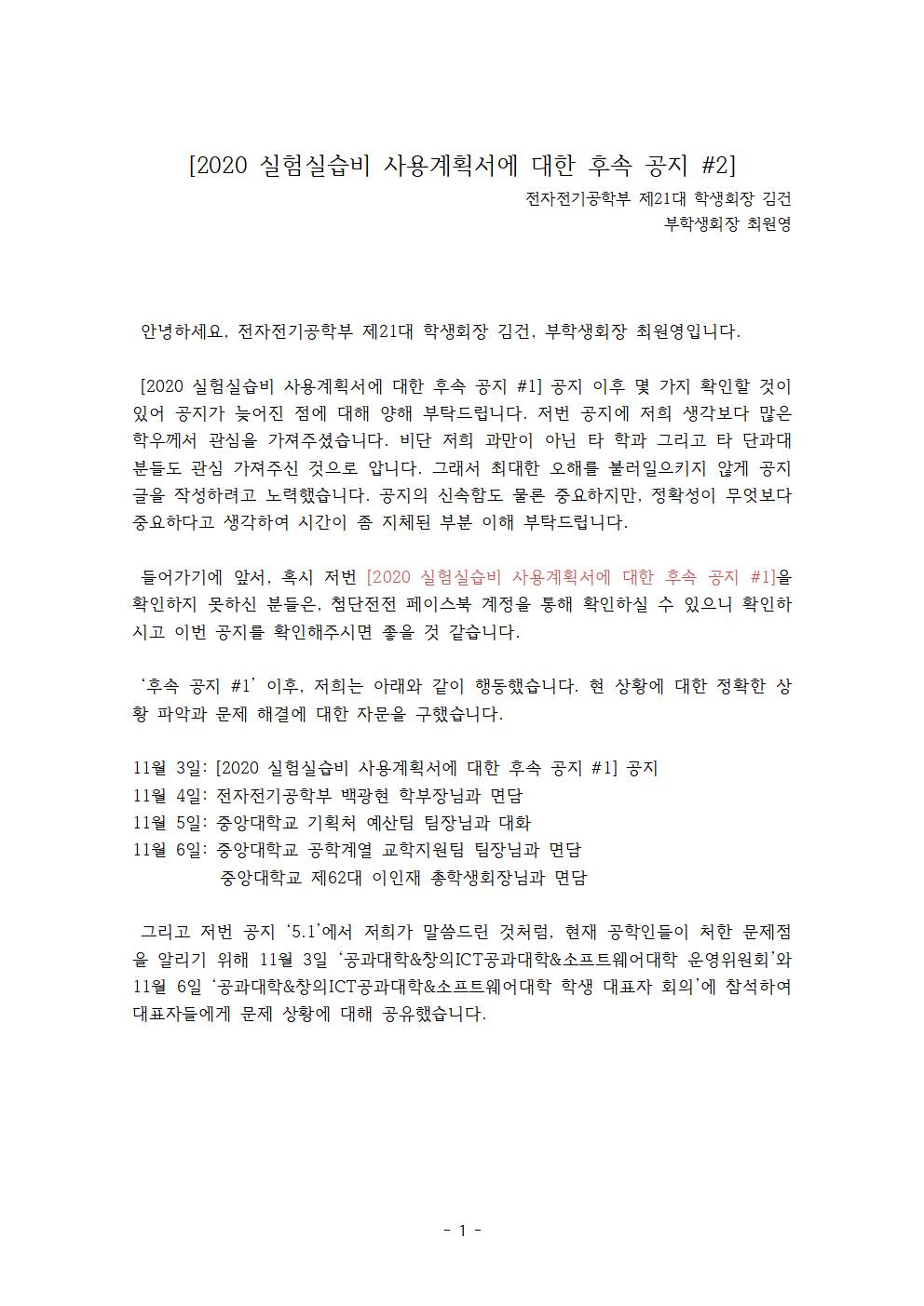 전자전기공학부 학생회는 이번 2학기 초 통일공대 학생회를 통해 본부에 ‘실험실습비 반환 관련 단위 요구안’을 제출했다. 본부는 실험실습비 사용계획서를 공지하라고 단과대별로 요청했고, 10월 28일 공대 홈페이지에 사용계획서가 게시됐다. 전자전기공학부 학생들은 이를 보고 실험실습비 예산 항목과 총액에 대해 온라인 커뮤니티 ‘에브리타임’을 중심으로 문제를 제기했다. 학생회는 문제 제기를 기반으로 문제 상황을 파악했고, 다른 주체들과의 접촉도 시작했다. 학생회는 본부, 학부장, 통일공대 학생회와 계속해서 면담을 진행했다. 공과대학 대표자회의에서는 상황 공유를 통해 공론화를 이끌었다.