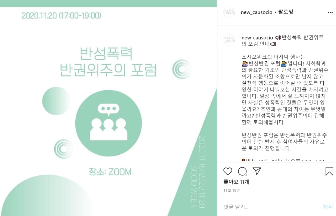 올해는 ‘숙원사업’이었던 반성폭력회칙을 제정했다. 김윤진 학생은 “사소할지라도 스스로 성폭력적, 권위주의적인 행동을 하지 않겠다는 약속은 과 문화 전반으로 이어진다”고 말한다. 또한 이는 방관과 2차 가해로 일관하는 태도의 문제를 인식하고, 지금까지 폭력이라고 느끼지 못했던 일상적인 차별과 폭력을 다시 새로운 시각에서 바라보는 계기가 된다고 덧붙였다.