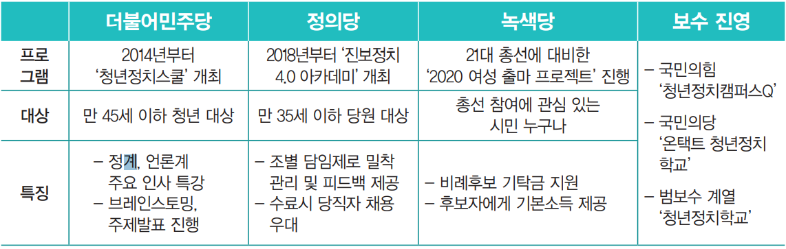 정치 선진국에 비해서는 아직 갈 길이 멀지만, 한국에서도 당내 인재 육성이 최근 몇 년간 정치 혁신의 주요 화두로 부상했다. 인재 양성에 초점을 맞춘 청년 정치 프로그램이 ‘늙은 정치’를 돌파하려는 정당들의 새로운 트렌드가 된 것이다.