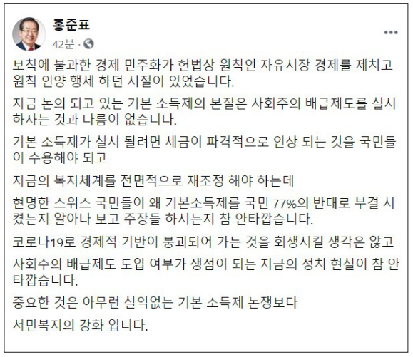 기본소득이 공산주의적이라는 주장은 특히 보수 진영에서 꾸준히 제시되고 있는 비판이다. 지난 6월 무소속 홍준표 의원은 당시 정치권에서 이뤄지고 있는 기본소득 논의가 “사회주의 배급 제도를 실시하자는 것과 다름이 없다”고 일축한 바 있다. 보수는 경제적 자유주의에 입각해 사유재산과 경쟁, 개인의 노력을 핵심가치로 삼는 시장경제를 중시한다. 반면, 사회 전반의 부를 전용하여 근로 의사가 없고 노력을 하지 않는 개인에게도 공평하게 나눠주는 기본소득은, 마치 재산몰수와 배급제를 통해 평등을 실천하고자 한 공산주의, 사회주의 체제를 연상시킨다.