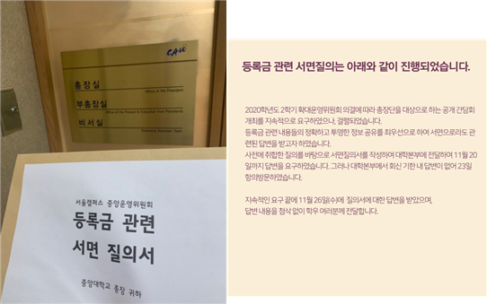 - 중앙대 서울캠퍼스 총학생회, “등록금 반환 관련 협의 보고”, 2020.08.08. [본문으로]