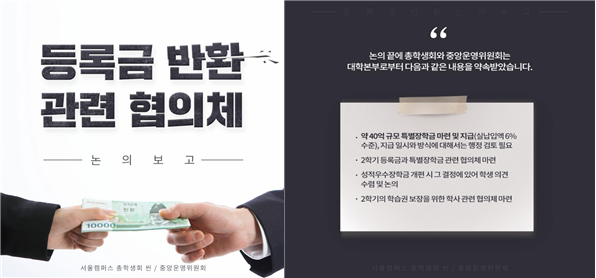 이렇듯 강하게 이어진 학생사회의 요구에 못 이겨, 연이어 등록금 반환 결정을 내리는 타 대학들 때문이었을까? 중앙대에서도 8월 3일과 5일 이틀에 걸쳐 등록금 반환에 관한 회의가 개최됐다. 학생 대표로는 이인재 서울캠퍼스 총학생회장(전자전기공학부 4)과 경영경제대학 최승혁 학생회장(경영학부 3), 안성캠퍼스 김진한 비상대책위원장(연희예술전공 4)과 생명공학대학 김무성 학생회장(식품공학전공 3)이 참석했다. 회의 과정에 대해 알 수 있는 자료는 8월 8일 서울캠퍼스 총학생회가 발행한 〈등록금 환불 협의 보고〉 카드뉴스가 유일하다. 이에 따르면, 학생 대표자들은 코로나로 인한 미집행 예산 등을 모아 특별 장학금의 형태로 등록금을 반환해야 한다고 주장했다. 또한 학교 구성원인 학생이 학교의 상황을 이해할 수 있도록 학교 재정 상황을 구성원들에게 투명하게 공개하라고 요구했다.