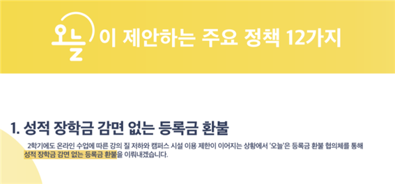 비록 올해는 등록금을 온전히 찾지 못한 채 흘러갔다. 그러나 개정안 시행과 새로운 학생 대표자들의 취임에 힘입어 등록금 반환 논의는 새로운 국면을 맞는다. ‘성적 장학금 감면 없는 등록금 환불’을 첫 번째 공약으로 제시한 ‘오늘’ 총학생회가 학생들이 기대하는 등록금 환불을 얻어낼 수 있을 것인지 기대해 본다.