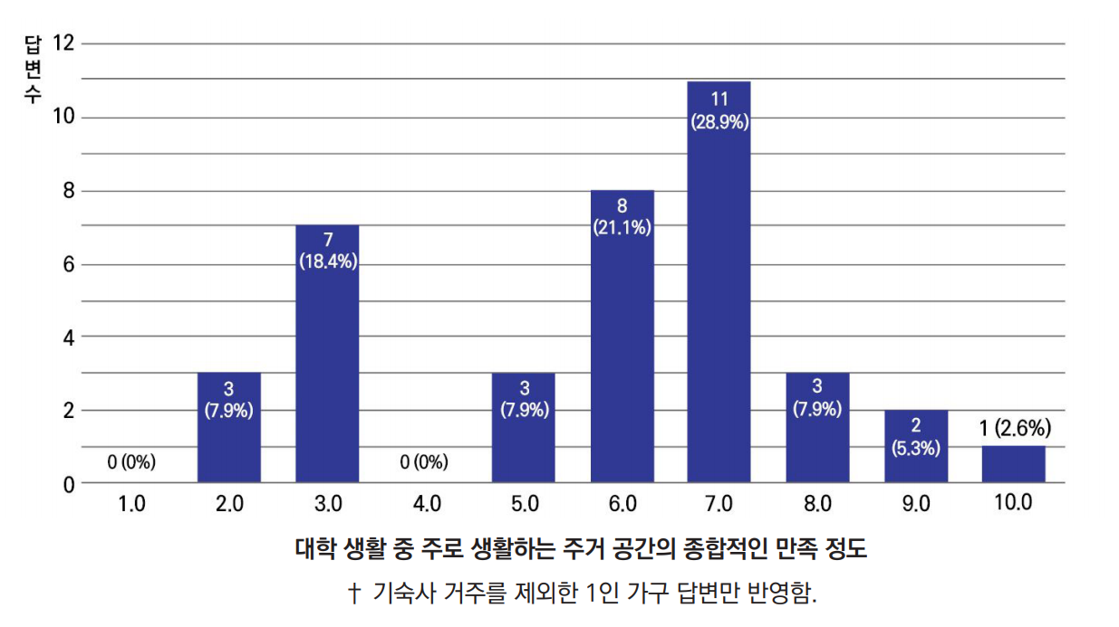 기숙사에 들어가지 못한 학생들, 또는 자유로운 생활과 사적 영역을 보장받고자 하는 학생들의 선택은 '자취'다. 그렇다면 과연 그곳에 살고 있는 이들은 자신의 집을 어떻게 생각하고 있을까? 기숙사에 거주 중인 응답자를 제외한 1인 가구의 주관적인 주거 만족도를 살펴보았다.