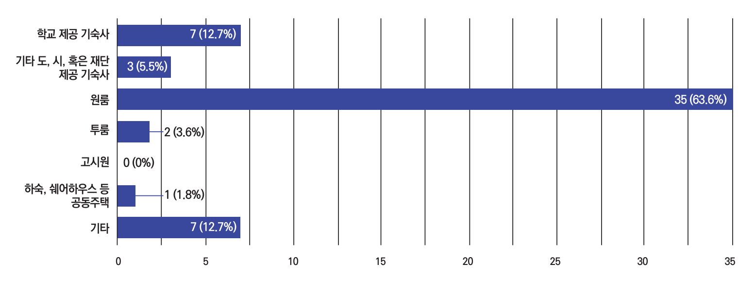 주거 형태를 묻는 질문에는 원룸에 거주 중이라고 밝힌 응답자가 63.8%로 제일 많았다. 기타의 사례로는 아파트, 오피스텔 등이 있었다.
