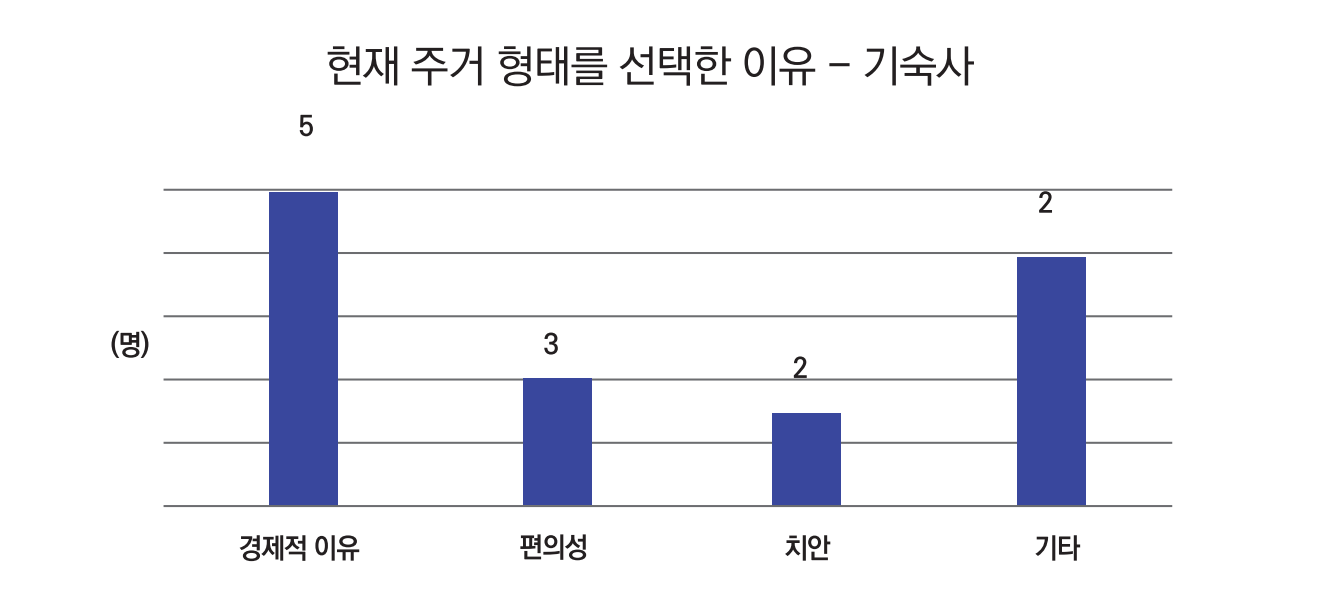 자체적으로 진행한 주거 실태 조사에서도 학생들은 기숙사에 거주하는 이유로 ‘저렴하다’, ‘가격 대비 성능이 좋다’ 등 경제적인 부분을 가장 많이 언급했다. 기숙사에 여러 시설이 갖추어져 있어 편하다거나 치안이 좋다는 응답이 뒤를 이었다.