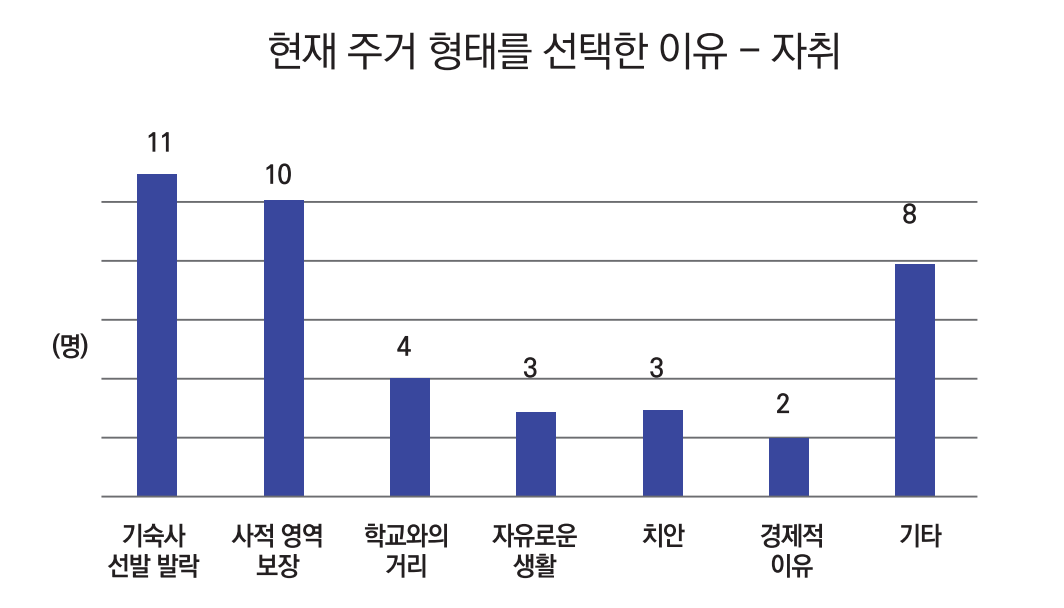 자취를 하는 학생들은 ‘현재 주거 형태를 선택한 이유’에 대해 다음과 같이 밝혔다. '기숙사 선발 탈락'(26.8%)이 학생들이 자취방으로 향하는 이유 중 가장 큰 비율을 차지했다. 또한 ‘사적 영역 보장’이 뒤를 이었으며, 주변 상권이나 이전에 살던 주거 형태에 불만을 느낀 경우가 포함된 ‘기타’를 선택한 답변도 확인할 수 있었다. ‘경제적 이유’로 자취를 결정한 학생들은 기숙사가 아닌 일반 주택에서 월세 형태로 생활하는 것이 ‘가장 저렴한 주거 방법’이었다고 설명했다.