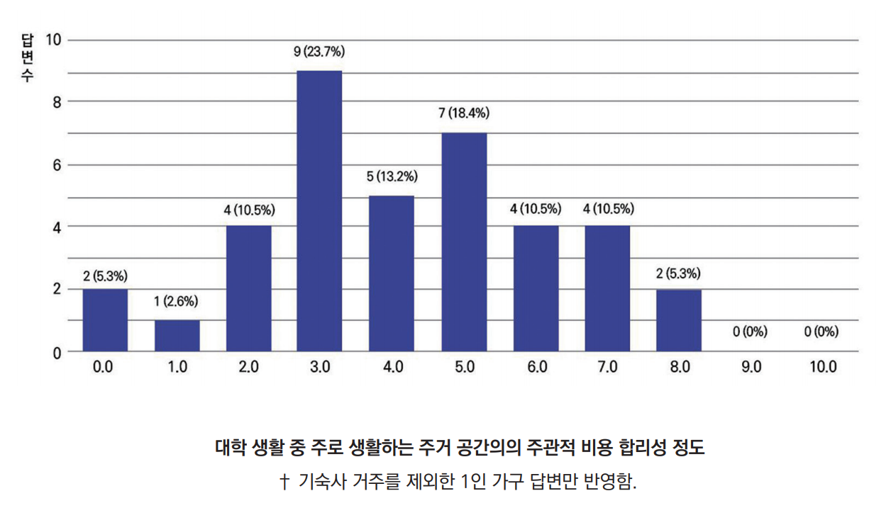 절반 이상은 되던 주관적인 종합 만족도 평가는 비용의 합리성을 묻자 4.18점까지 떨어졌다. 해당 점수를 매긴 근거를 묻자 심지어 이전 질문에서 불만족하는 항목으로 '높은 비용'을 고른 응답자 수(71.1%)보다 많은 78.9%(30명)가 비용 문제를 언급했다. 주거 비용에 불만족하지 않는 사람들도 그 비용의 합리성에 대해서는 의문을 갖는다.