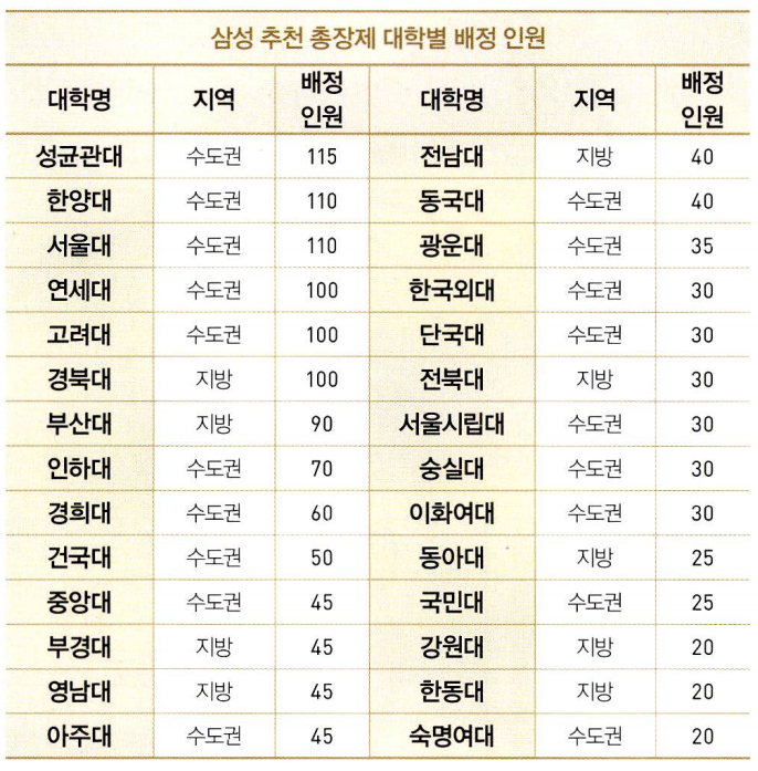 올해 상반기 삼성그룹에서 새로 정규직 인원을 고용하는 방식 으로 ■총장추천제’를 발표하여 각 대학에 인원을 통보하여 논란이 된 적이 있다. 표를 살펴보면 중앙대는 삼성그룹으로부터 45명을 할당받았다. 이 지표를 진지하게 받아들이면, 그것은 곧 채용 인 원수만큼 서열화가 이루어지는 대학의 위계질서를 받아들이는 것 을 의미한다. 대학이 기업을 위해 맵시를 잘 가꾸고 매력적으로 보 이도록 자기 자신을 잘 관리하게 될수록 대학의 자율성은 파괴될 수밖에 없다