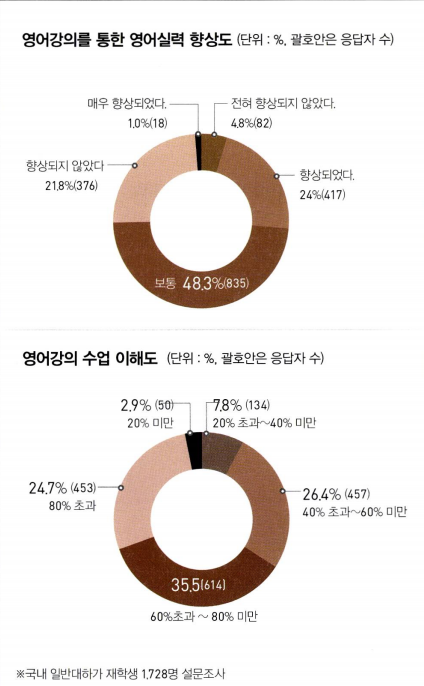 영어강의가 실질적으로 도움이 되느냐에 대해서는 부정적인 답 변이 대부분이다. 홍지영 부산시의회 연구위원과 이광현 교수의 「대학 영어전용 강의 실태와 학습 효과」논문에 의하면, 대학생 10명 중 4명가량이 영어강의의 60%도 이해하지 못했으며, 영어강 의가 영어 실력 향상으로 이어졌다고 답변한 학생은 4명 중 1명에 불과했다. 사정이 이렇다 보니 무늬만 영어강의일 뿐 궁여지책으 로 한국어와 영어를 혼합해서 강의하거나 학생들의 동의 아래 한 국어로 강의하는 경우도 적지 않다.