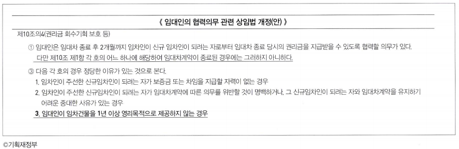 또한, 개정안에는 임대인의 협력의무를 면제해주는 단서 조항 이 달려 실효성에 의문이 제기된다. ■임대인이 임차건물을 1년 이 상 영리목적으로 제공하지 않는 경우(③-3)에는 임대인에게 협력 의무가 부과되지 않는다 즉 . 건물주가 상가를 1년 동안 비워두거 나 비영리 목적으로 이용할 땐, 임차인에게 권리금 회수 기회를 제 공하지 않는다는 말이다. 전국상가세입자연합회는 이 단서 조항 을 두고 “임대인이 1년간의 임대료와 권리금을 비교하여 권리금이 더 클 경우에, 상가세입자를 쫓아내고 비영리로 1년을 사용한 후에 다음 상가세입자에게서 관리금을 직접 받는, 권리금 강탈의 수단으로 이용될 가능성이 매우 높다:’며,“임대인이 법의 허점을 이 용하여 상가세입자를 착취할 수 있는수단을 남겨 놓아서는 안 된 다:’고 주장한다. 4제10조 제1항 각 호의 어느 하나에 해당하여 임 대차계약이 종료된 경우(①)에도 임대인에게 협력 의무가 없다. ‘제 10조 제1항 각 호’를 흔히 상임법의 ‘예외조항’이라부른다. 이 예외 조항은 임대인의 협력 의무 면제 사유뿐만 아니라,계약생신 거절 사유도 된다. 현재 발생하는 임대차 분쟁에서 가장 첨예하게 갈등 하는 지점도 바로 예외조항부분이다.