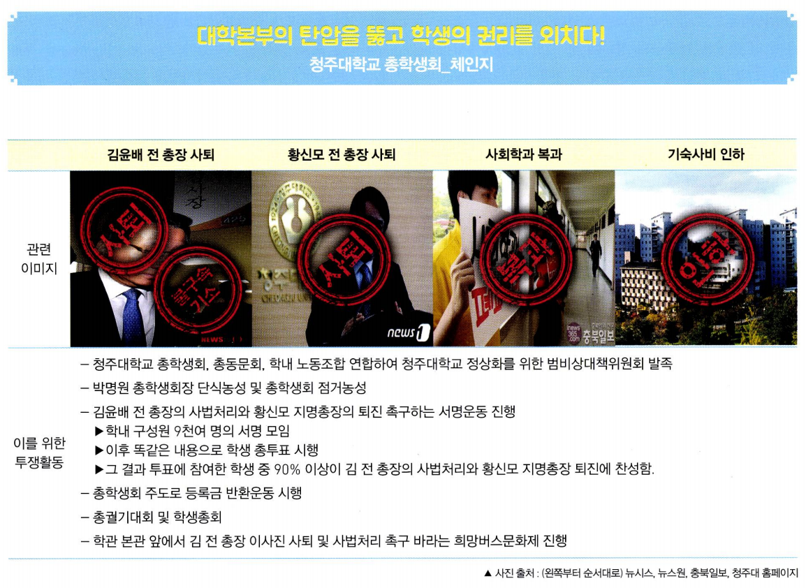 청주대학교는 사학재단의 비리로 여러 해 전부터 골머리를 앓아왔다. 등록금은 터무니없이 높은데, 교육환경은 열악해 학생들의 원성이 자자했다. 참고로 청주대의 적립금 액수는 2013년 기준으로 전국 사립대 중 6위, 지방대 중 1위를 기록하고 있다. 반면 학생 1인당 교육비 지출은 107위, 장학금 지급은 108위로 전국 하위 수준이다. 2014년 8월에는 정부재정지원 제한대학에 선정되었고, 심지어 올해에는 교육부 구조개혁평가에서 D, E 등급에 해당하는 결과를 통보받기도 했다. 이때 청주대학교는 ▲학생학습역량 강화 ▲진로 및 심리상담 ▲취·창업지원 ▲교육비 환원율 ▲교육수요자 만족도 지표에서 모두 기준치에 미치지 못한 점수를 받았다.