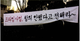 사업계획서 내용조차 학내구성원에게 공개되지 않은 상태에서 어떤 유의미한 소통과 합의가 이루어질 수 있었을지 역시 의문이다. 전체학생대상 설명회에서 본부는 개괄적인 단과대별 정원조정계획과 프라임사업의 추진배경 등을 설명했을 뿐 학과단위의 정원조정안이나 정원감축대상학과에 대한 구체적 발전계획안 등을 공개하지 않았다.2 심지어 학생들과 교수진을 비롯해, 프라임사업 지원을 위한 구조조정안을 심의한 평의원회 의원들에게조차 사업계획서 전문과 그 세부내용은 공개되지 않았다. 아무것도 제대로 공개된 적 없는 상황에서 합의를 논하기란 무의미하다.