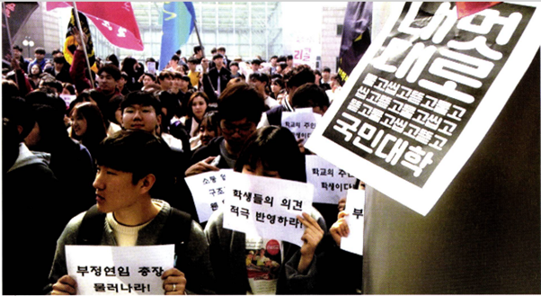 국민대학교 유지수 총장은 올 1월 초 구조조정 계획을 알렸다. 구조조정의 대상이 된 삼림과학대 학생대표자는 지속적으로 학내여론을 수렴하고 소통 없는 본부를 규탄했다. 합의진행이 이루어지지 않자 국민대학교 학생들은 ‘국민대 학교 대학구조조정 학생대책위’(이하 학대위)를 발족했다.