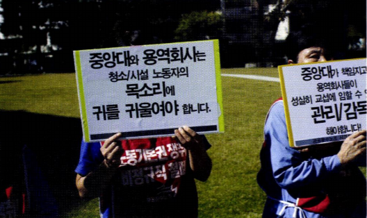 여기, 중앙대에서 수년간 교정을 청소하고, 중앙대 기계들을 고쳐온 사람들이 있다. 그들은 중앙대 학생들의 등록금으로 임금을 지급받고 중앙대 CI가 그려진 옷을 입고 노동을 한다. 그러나 그들은 중앙대 소속이 아니다. 중앙대와 무관한 용역업체 소속이다. 무슨 일일까?