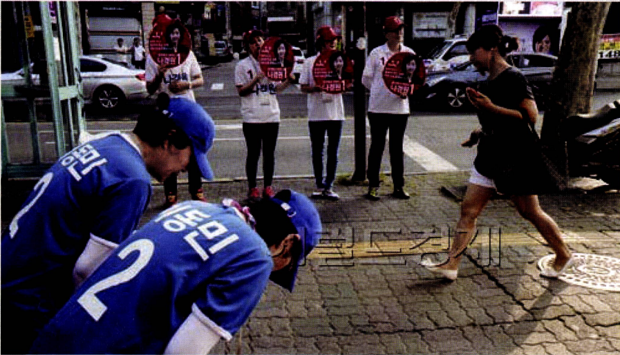 두 시간 동안 똑같은 자리에 서서 로봇처럼 인사를 하니 다리 가 터질 것 같았다 또 제법 큰 피켓을 들고 인사를 하느라 팔도 저 렸다 차라리 돌아다니면서 인사를 하는 것이 덜 힘들었다. 우리 팀은 선거운동 방식에 있어서 시간보다는 효율을 더 중요하게 생각했다. 그래서 유권자!■의 이동이 많은 아침과 저녁 시간에는 출퇴근 인사를 길게 했고 유권자들의 이동이 적고 날씨가 더운 점심시간에는 휴식을 취하기로 했다.