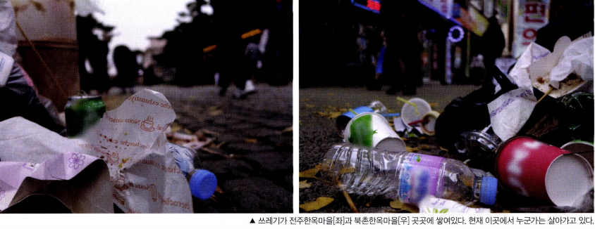 이처럼 주민이 배제된 관광사업을 벌이다보니 주민 생활공간에 대한 배려는 뒷전이다. 북촌이든 전주든 한옥마을 거리에는 휴지 통이 부족해 곳곳마다 쓰레기가 넘쳐난다. 전주 한옥마을의 한 카 폐로 출퇴근한다는 송지원(21)씨는 교통이 너무 혼잡해서 오히려 자신이 관광객이 된 느낌을 받는다고 불만을 표했다. 하지만 이렇게 생활환경의 침해로 주민들이 받는 고통은 관광사업 추진에 뒷 전이거나 대개 소 읽고 외양간 고치기 식으로 논의가 된다. 지난 10월 전주시는 한옥마을 전 구간을 차 없는 거리로 확대하면서, 한옥마을 주민에게 1가구 1 차량 정책을 시행한다고 발표했다. 9 이 는 주민들의 불편함은 아랑곳 않고 철저히 관광객의 편의만을 위 한 정책이다 실제 한옥마을 거주민인 김미경(22)씨는 전주시의 주 민 차량 제한에 대해 거주민들의 불만이 굉장히 많다고 토로했다 이계 이곳에서 곧 떠날 사람들은 관광객이 아니라, 오히려 지역 주 민이 되어버린 셈이다.