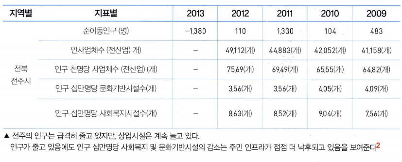 없어질 위기에 처한 초등학교와는 대조적으로 상업시설은 급격 히 늘어나고 있다. 십 여 년 전인 2005년 전주 한옥마을 근방의 상 업 시설은 83개에 불과했으나 현재 366개로 급증했다/* 현재 한옥 마을 일대에 있는 전통 힌-옥의 수가 총 603 채임을 고려했을 때, 5 한옥 두 채 꼴로 상업시설이 하나 넘게 있는 셈이다.