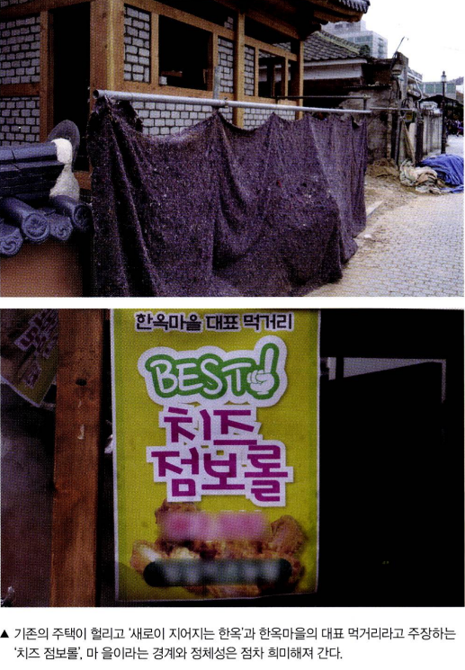 이렇게 수많은 자본들이 관광 사업이라는 명목으로 마을에 들 어서면서 주거 지역의 땅값과 물가는 폭등했다. 전주 한옥마을의 변두리에서 자영업을 하고 있는 K 씨(50)는 마을 중심부의 임대료를 도저히 버털 수 없어 밀려난 가게들이 수두룩하다고 증언했다. 서울 종로구 서촌에서 카페를 운영 중인 L 씨(35) 역시 북촌의 인 기가 과열되자 옆 동네인 서촌의 임대료까지 급증하는 추세라고 한숨을 쉬었다 결국 지금 여기에 살고 있는 주민들은 경제논리에 따라 떠날 수밖에 없다. 살아가던 주민들은 사라지고 관광객을 기 다리는 상가만이 남았다.