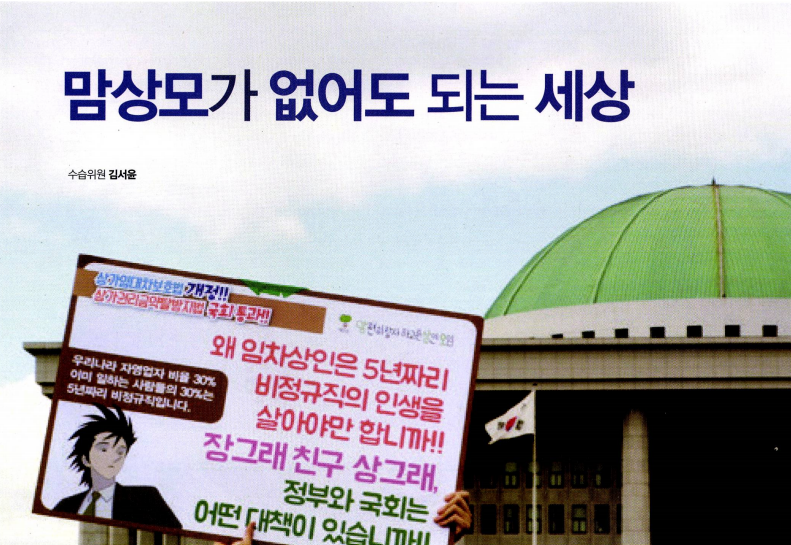 보통 상인회라고 하면, 많이들 상가 번영회나 지역시장상인회를 떠올리기 마련이죠. 그러한 모임의 목적은 상가를 번영시키거나 수익을 올리려는 데 있어요. 하지만 맘상모는 구조적인 문제, 법률적인 문제의 해결을 목표로 삼는 단체에요. 엄밀히 따지면 공익을 표방한다 할 수 있죠. 저희는 상인만의 이익을 외치는 것이 아니에요. 서로 동등하고 합리적인 관계로 나아가자는 거죠. 그 이상은 바라지 않아요. 심지어 맘상모 구성원들 중에는 임차인인 동시에 임대인으로 살아가는 회원들도 있어요. 이들을 포함해서 맘상모에 속한 많은 사람들이 갑,을의 입장을 모두 고려하려 해요. 다만 현재는 둘 중 한 쪽으로 너무 치우쳐 있기에 바로잡으려는 거죠.