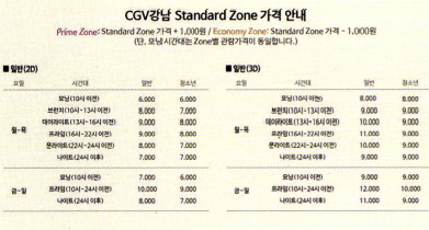 올해 3월 3일, CGV는 영화관람료 차등화를 도입했다. 스크린과 가까운 앞쪽 20%는 이코노미존, 중간 40%는 스탠더드존, 뒤쪽 40%는 프라임존으로 나눠 이코노미존은 천원 낮게, 프라임존은 천원 높게 가격을 책정했다. CGV가 독점 사업을 하고 있는 아이맥스는 주중 천원, 주말 2천원을 인상했다. 주말에 아이맥스관(3D) 프라임존 좌석에서 관람하면 기존 가격보다 최대 3천원이 오른 2만원에 관람하는 셈이다. 4월 27일, 롯데시네마도 CGV에 이어 가격을 인상했다. 롯데시네마는 주중 일반과 심야는 기존 대비 2천원을 인하했지만, 주말 및 공휴일 조조와 프라임 상영을 기존 대비 천원을 인상했다.