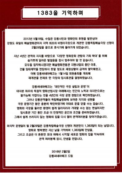 - 최성열, "[국내뉴스] 또 하나의 독립예술영화전용관이 사라진다”, 씨네21, 2015.10.30. [본문으로]